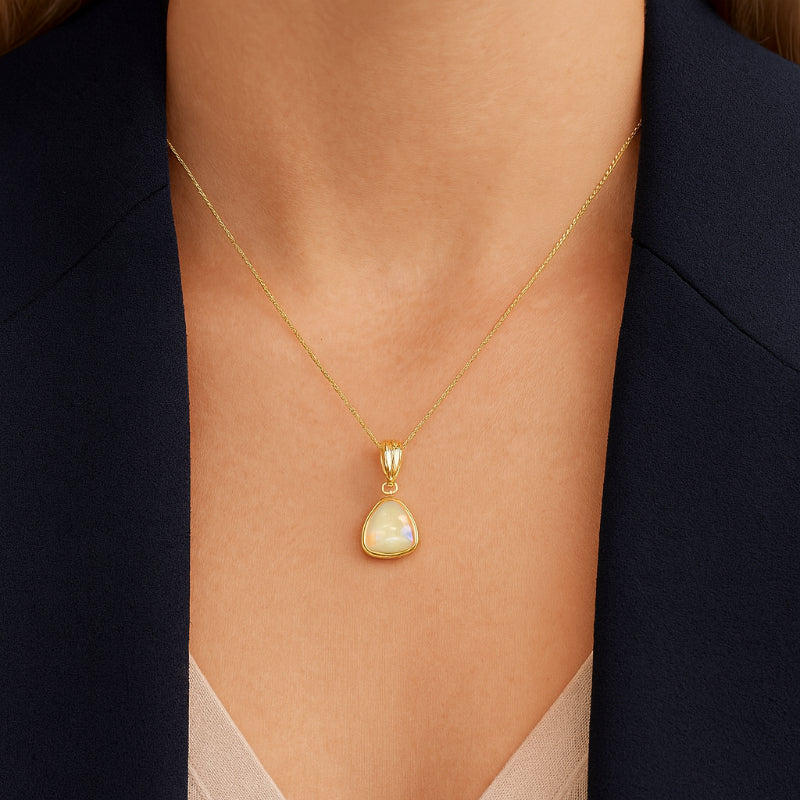 A striking triangular pendant in 9ct gold-plated sterling silver, set with a luminous 0.69ct white Australian opal.