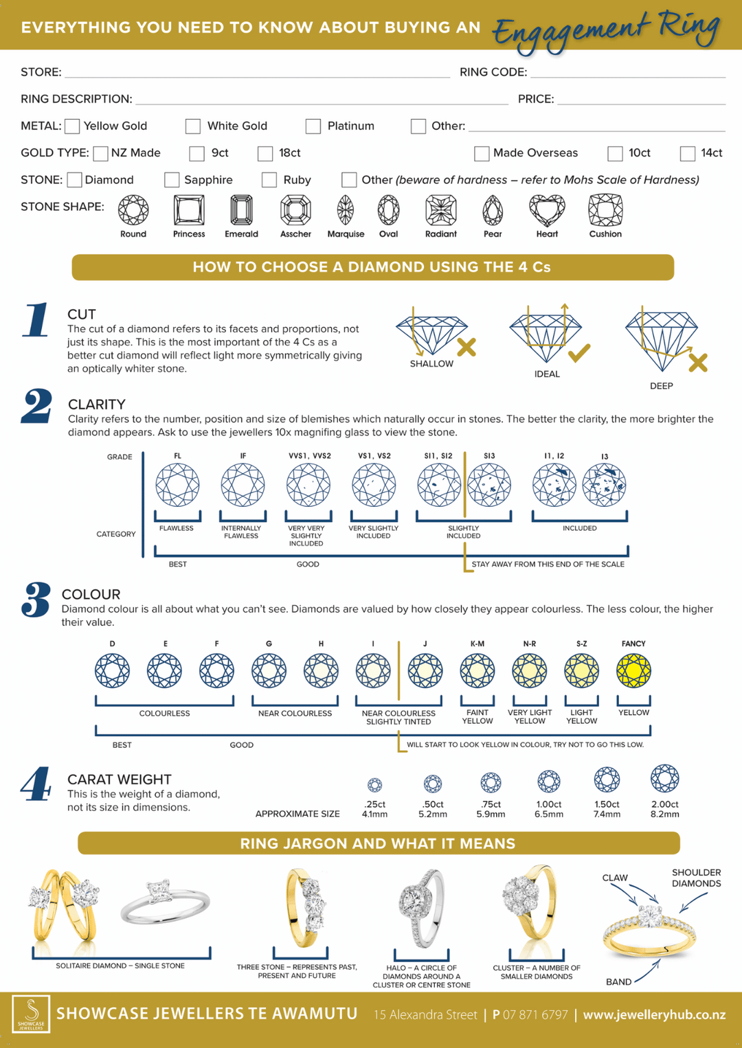 It’s important to be sure you’re getting good, honest advice from someone that will work with you, listen and take the time to help you. So, to help you as you embark on your quest for the perfect ring, we’ve created this guide with everything you need to know about buying an engagement ring. If you have any questions along the way, please feel free to pop in and see us at Showcase Jewellers Te Awamutu – your engagement ring specialists.